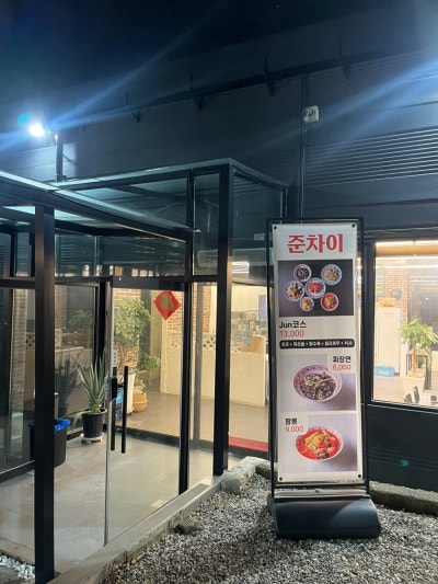 가게 앞에 넓은 주차공간이 있습니다. 차를 주차하고 바로 앞에 위치한 중국집 준차이(Junchai)로 들어갑니다. 매장 앞에는 코스요리 소개가 홍보되고 있다.