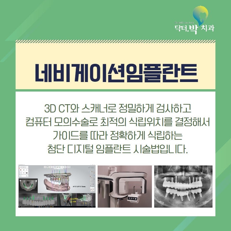 내비게이션 임플란트의 장점을 중심으로 자세히 설명드리겠습니다. 치아 상실로 인해 불편함을 겪고 계시다면 안전하고 정확한 내비게이션 임플란트의 내용을 천천히 읽어보시고 하단의 배너를 통해 빠른 예약/상담을 진행하시기 바랍니다.