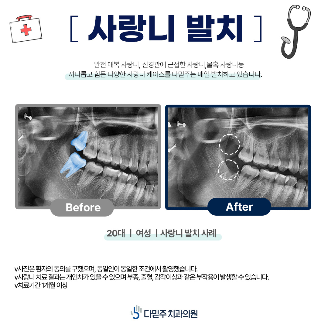 증상 자체가 복잡하기 때문에 단순히 발치만으로 해결될 수 있는 문제는 아니었습니다. 부산 사랑니 발치에는 주변 치아와 신경이 손상되지 않도록 주의가 필요하기 때문에 철저하고 체계적인 사전 검진이 필요했습니다. 어떻게 하면 불편함이나 통증 없이 빨리 통증에서 벗어날 수 있는지 구체적인 기준을 세우고, 매복치에 대한 상담과 치료를 진행한다면 나을 수 있으리라 믿어 의심치 않았습니다.