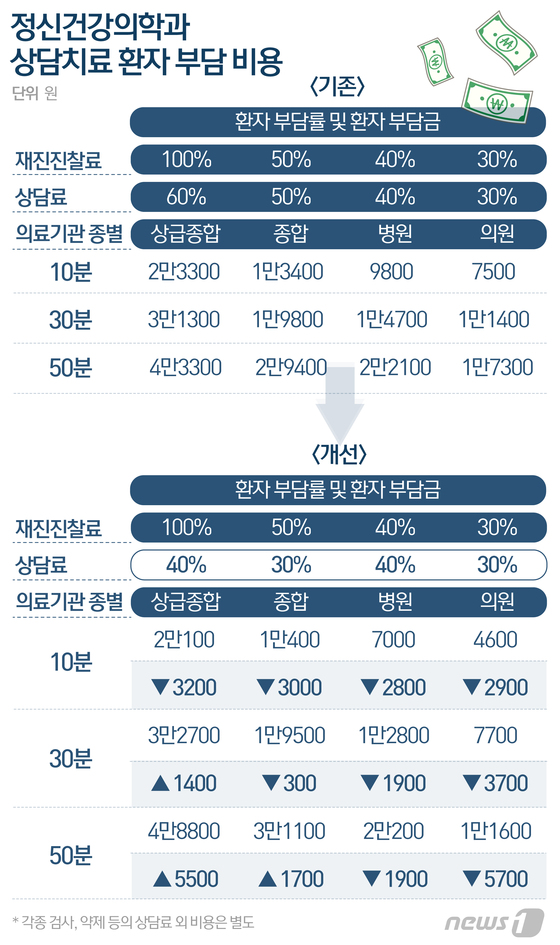 우울증 상담을 위해 심리상담센터 방문 시 1회 50분 기준으로 5~10만원 정도입니다. 온라인 심리상담(문자, 전화 심리상담)은 1회 50분 기준으로 1~5만원 정도입니다. 상담 종결까지 이 정도의 비용이 매주, 또는 격주로 발생합니다.(상담 횟수와 기간은 상담을 본격적으로시작하기 전에 결정하게 됩니다.) 2. 우울증상담센터, 비용 차이가 발생하는 이유는 뭔가요?