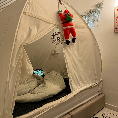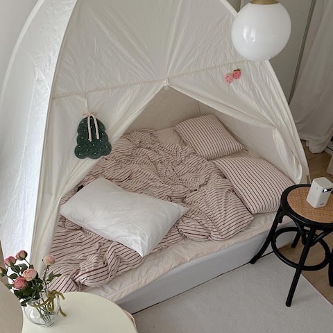 먼저, 침대나 수면 공간에 방한용 텐트를 설치하십시오. 밑면이 없는 디자인으로 매트리스에 밀착되어 외부의 찬 공기를 완벽하게 차단해줍니다.