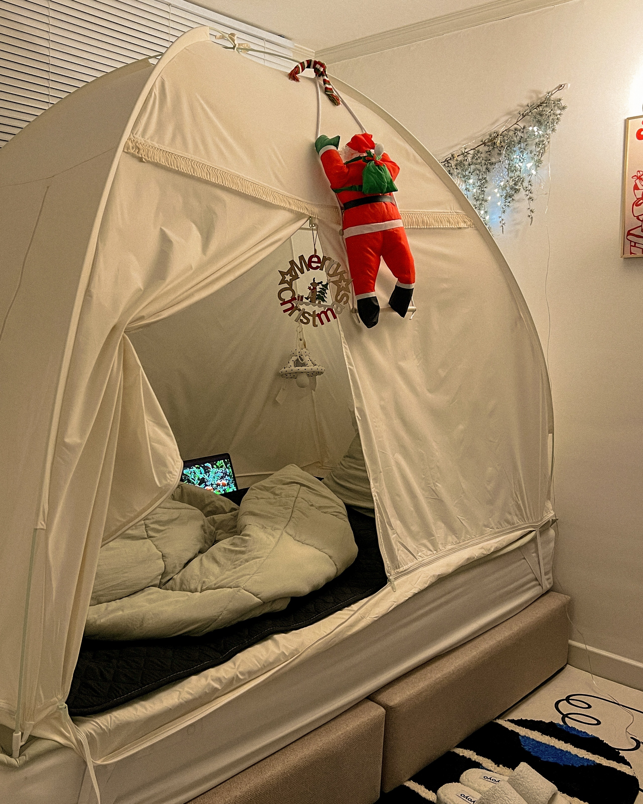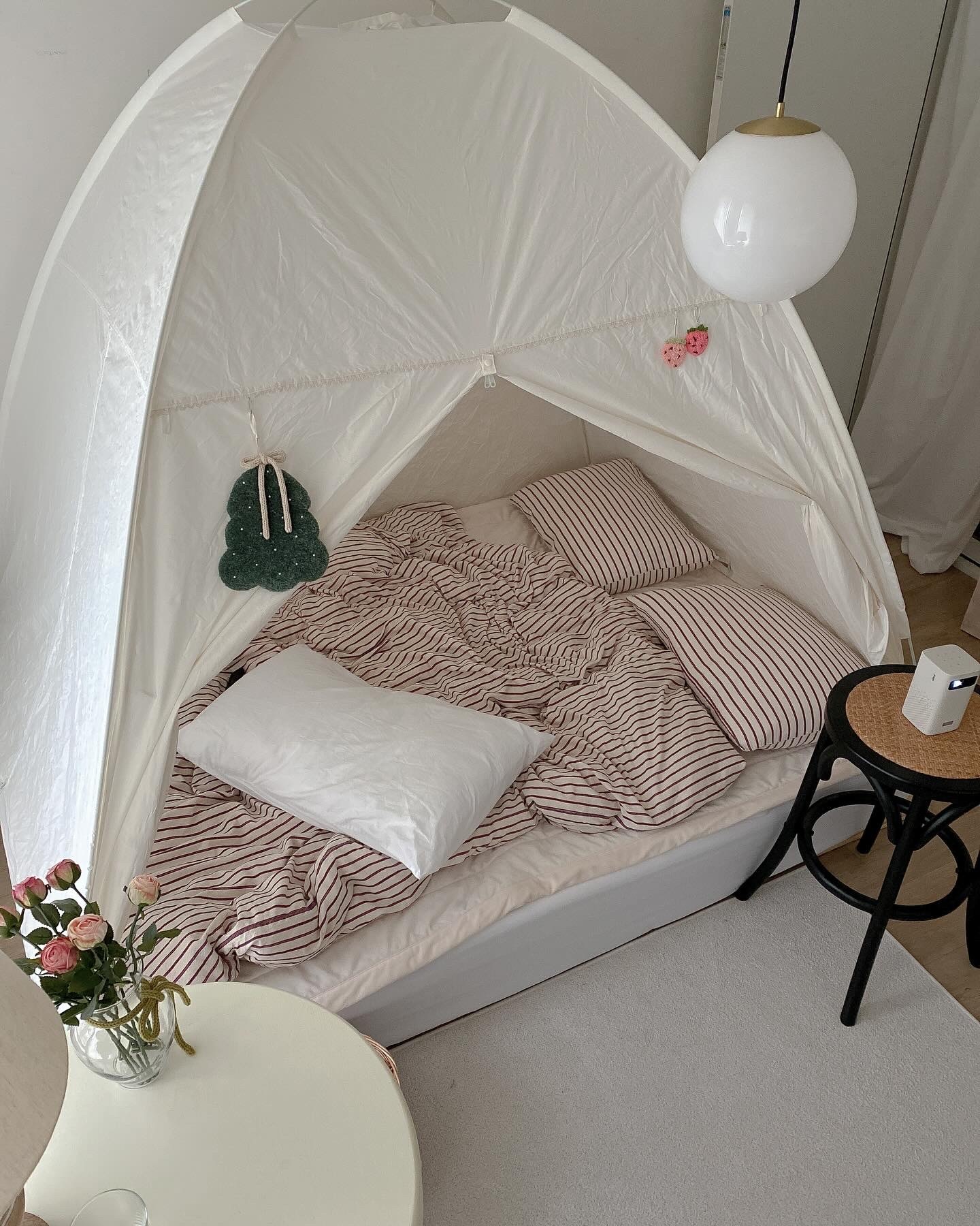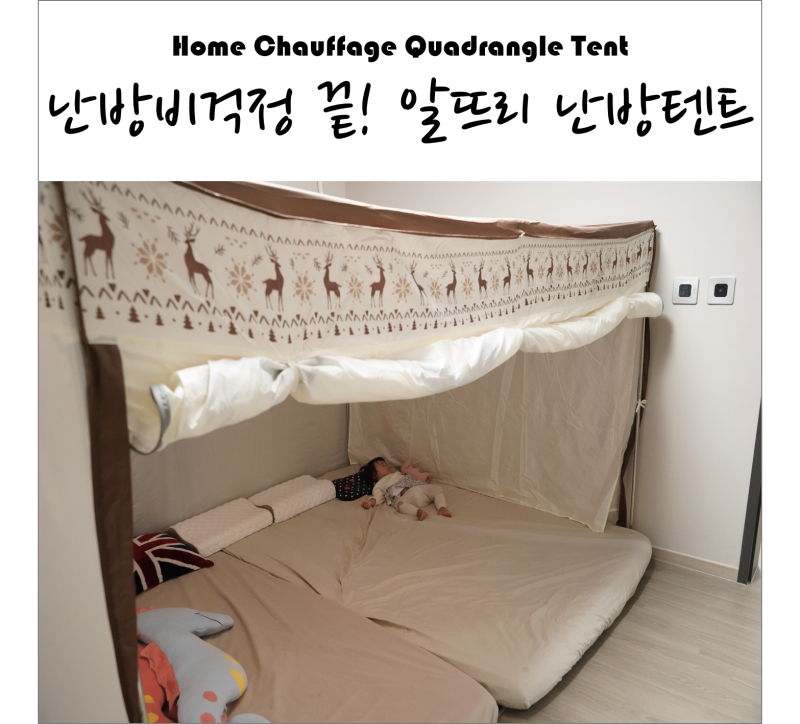 토퍼나 담요만 깔고 침대 대신 바닥에 놓고 사용해도 문제 없습니다. 그럴 땐 방한용 텐트를 설치하고 텐트 안에 담요나 토퍼를 넣어두시면 됩니다! 난방텐트 수면 루틴 #2
