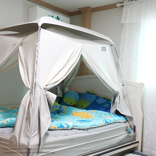먼저, 침대나 수면 공간에 방한용 텐트를 설치하십시오. 밑면이 없는 디자인으로 매트리스에 밀착되어 외부의 찬 공기를 완벽하게 차단해줍니다.
