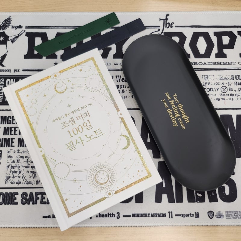 제가 자랑스러워하는 조셉 머피 문진과 세트로 준비한 필기노트, 펜트레이, 가죽책갈피 입니다. 밝고 예쁘죠?