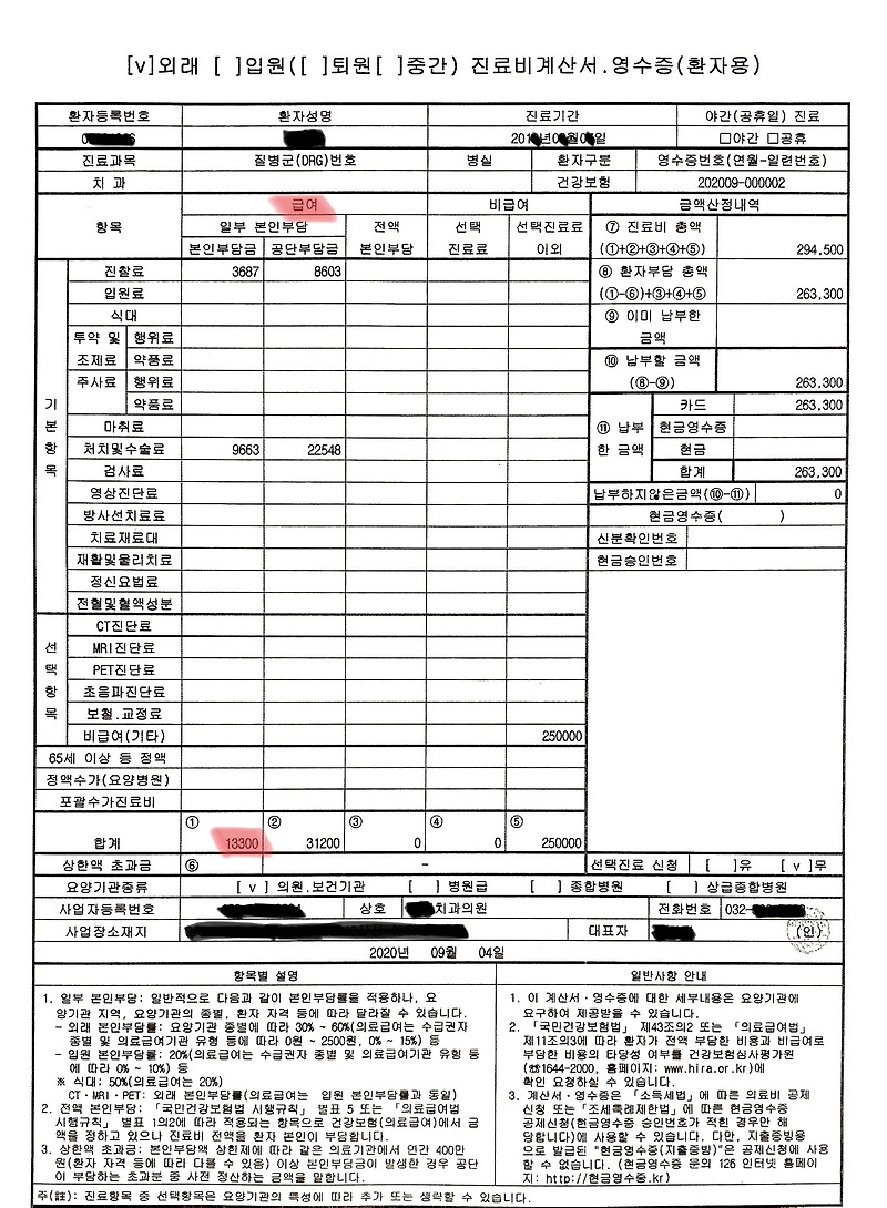 ▷ 과충전치료(아말감, 자가중합 레진충전), 발치, 스케일링, 파노라마, 임플란트, 의치, 치과검진용품, 신경치료 ▷ 비과충전치료(광중합형 복합레진, 폴리머) 시멘트, 인레이 포함인 것 같아요 , 온레이), 크라운 치료, 임플란트 및 의치, 치열 교정, 미백 및 라미네이션. 이 치과 진료실비는 166,800원이었으며, 이 중 140,000원을 실손보험으로 공제하였다. 받은 수수료는 약 25,000원이었습니다. 아래 제출물을 보여주면서 이렇게 받은 이유를 설명하겠습니다. 저는 11월 9일 병원에서 받은 영수증과 다음 방문 영수증입니다. 첫째, 비급여 부분은 진정한 손실 보험 청구와 전혀 관련이 없습니다. (비급여 항목은 12만원인데 잘 생각해보면 발치 비용인 것 같습니다) 급여항목 내용만 보면 알겠지만 본인이 지급하는 부분으로 나뉩니다 개인과 회사가 부담하는 부분. 이제 공제액을 살펴봐야 할 것 같습니다. 11월 9일 영수증에서 19,600~10,000원이 차감되므로 유료분에서 1만원을 빼면 9,600원이 됩니다. 11월 11일 영수증에 27,200-10,000원 빼면 17,800원입니다. 17,200원에 9,600원을 더하면 26,800원(실제 보험료)이 나오는데 아직 계산이 진행 중인 것 같습니다. 본인이 가입한 실제 보험회사에 접수하는 것이 최선이라고 생각합니다. 심사를 통과하고 개런티를 받으면 좋겠지만 그렇지 못하면 어쩔 수 없다. 또한 병력이 있는 경우 사전에 영수증을 받는 것이 중요합니다. 달라고 하지 않으면 간단한 진료비 영수증조차 주지 않는 곳이 많습니다. 그런 다음 치과 보험 소개 검토가 온다.